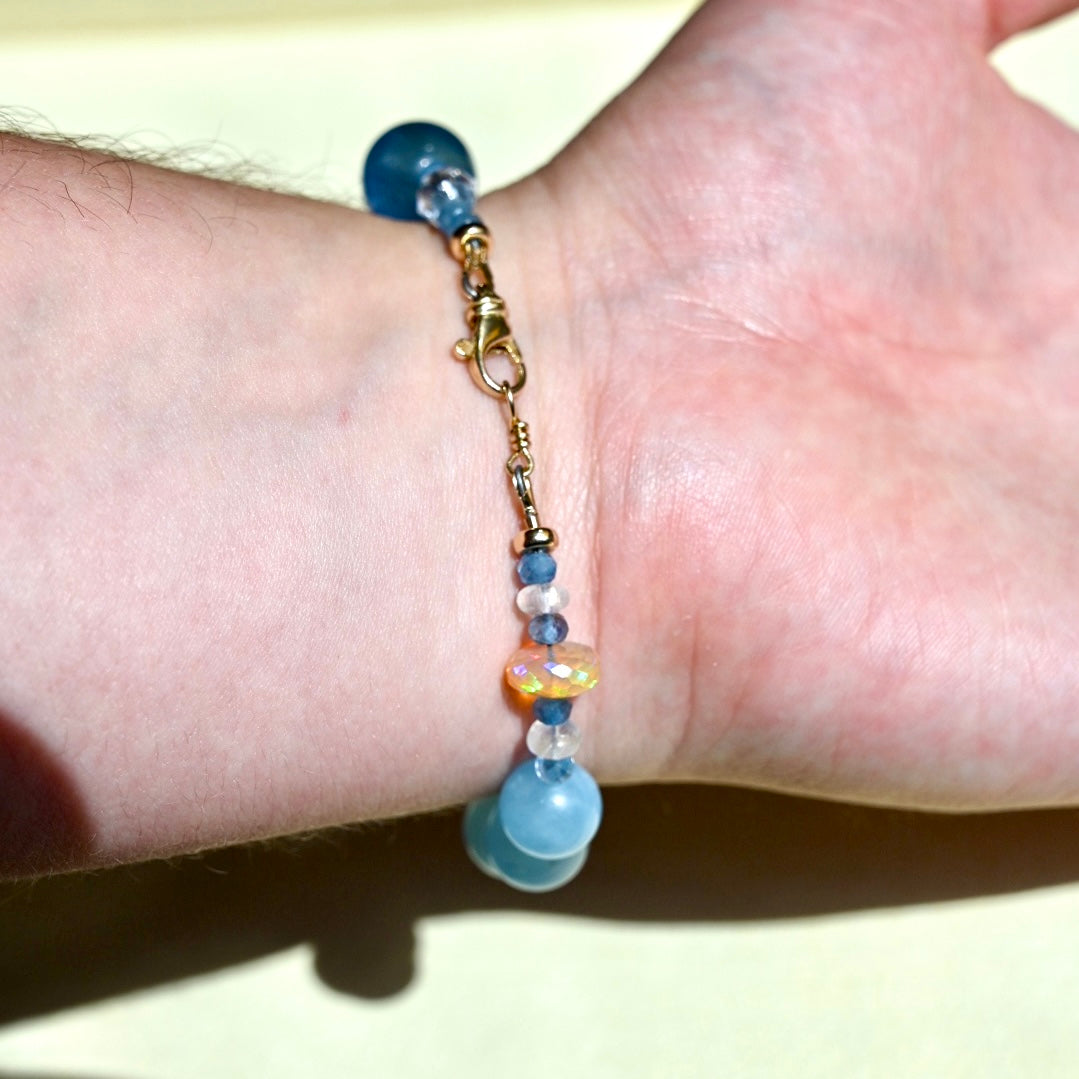 Beautiful blue bracelet made with beautiful rare blue fluorite, velvety blue aquamarine, blue flashy moonstones, one clear quartz bead, small faceted dark aquamarine beads and rondel opals. This is also finished with all 14K gold beads, a Large lobster clasp and finishing beads.