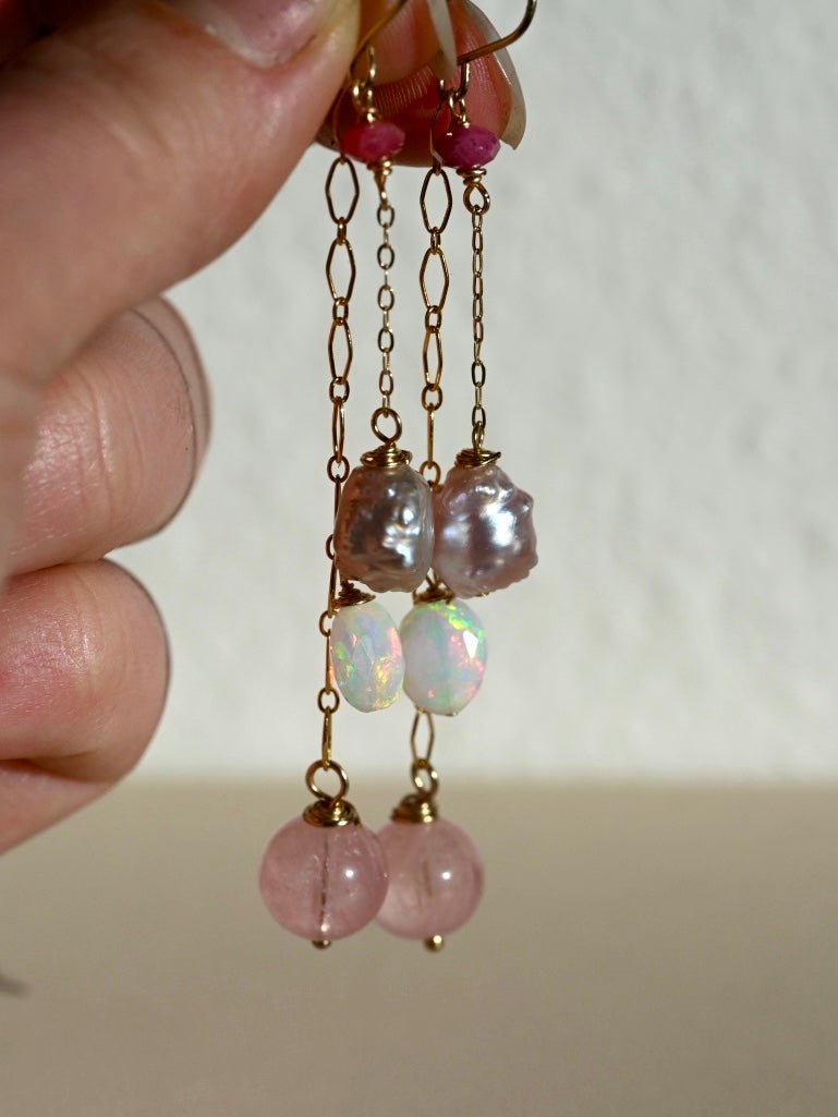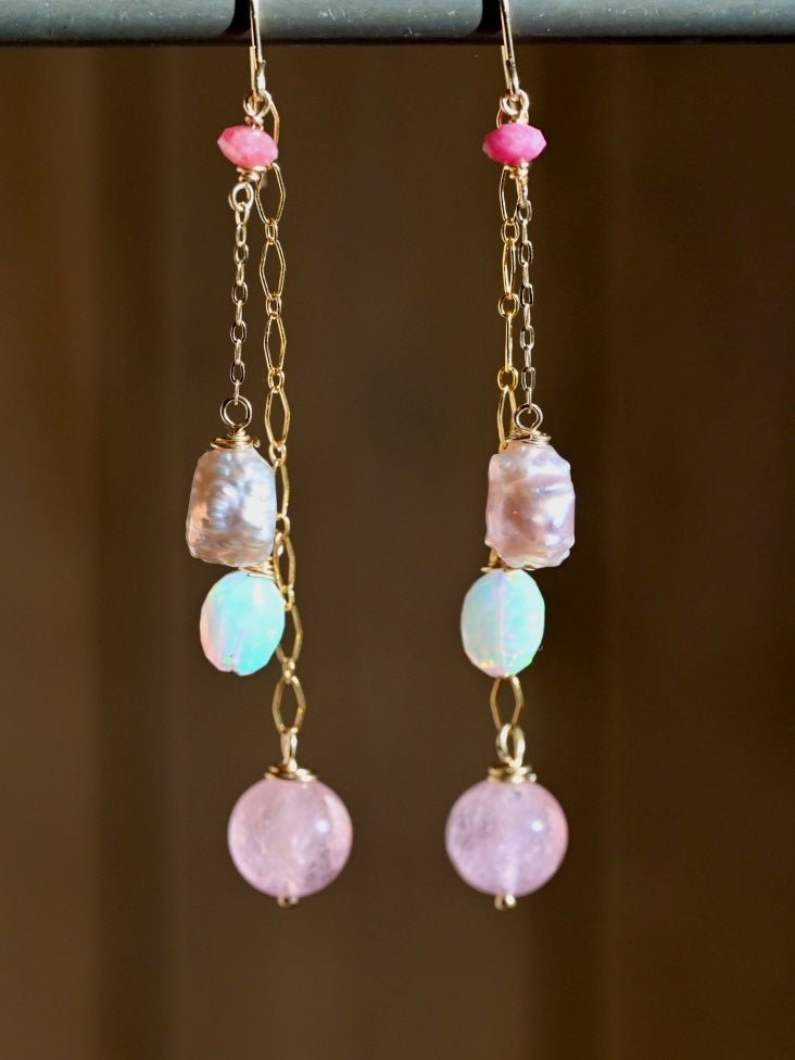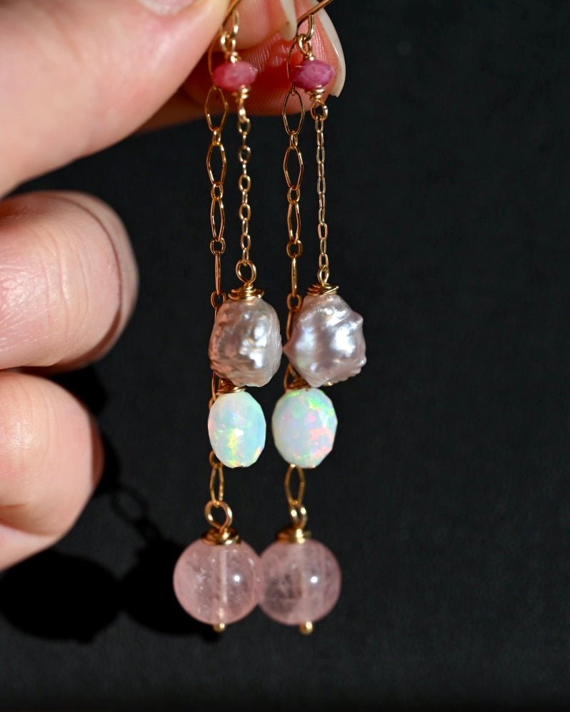 Pretty Pink Dangle Earrings - 14K Gold Fill - Opals, Morganite and Pearls - OpalOra Jewelry