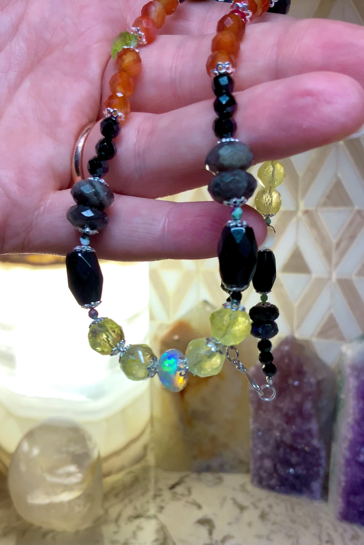 I love this necklace so much! The pipe opal is amazing in person. I've never seen an enhydro stone before, it's so cool to see the water dancing around inside the dancing colors of the opal. The delicate wrapped design with the aquamarine and other opals really come together to make this a stunning piece.