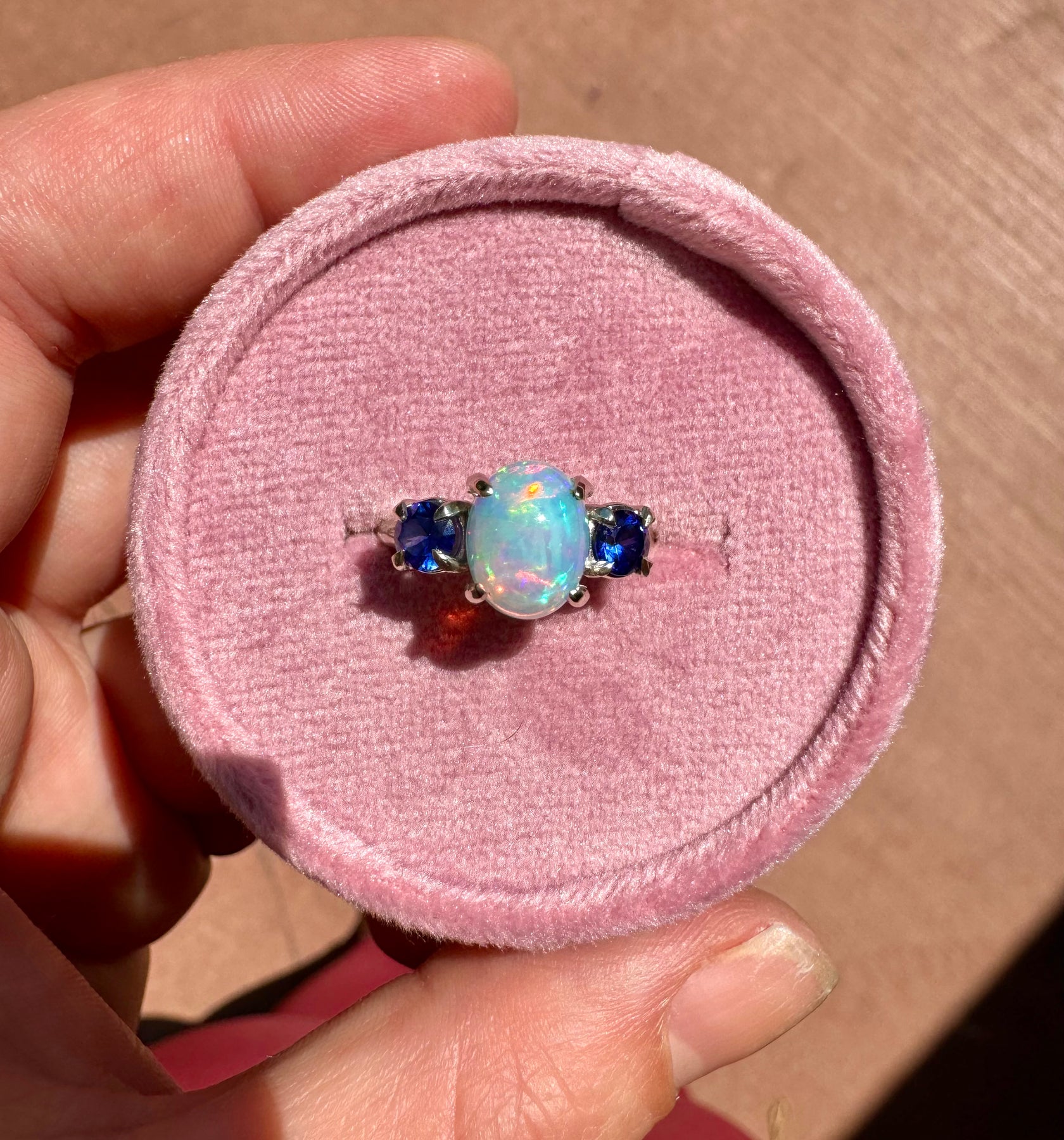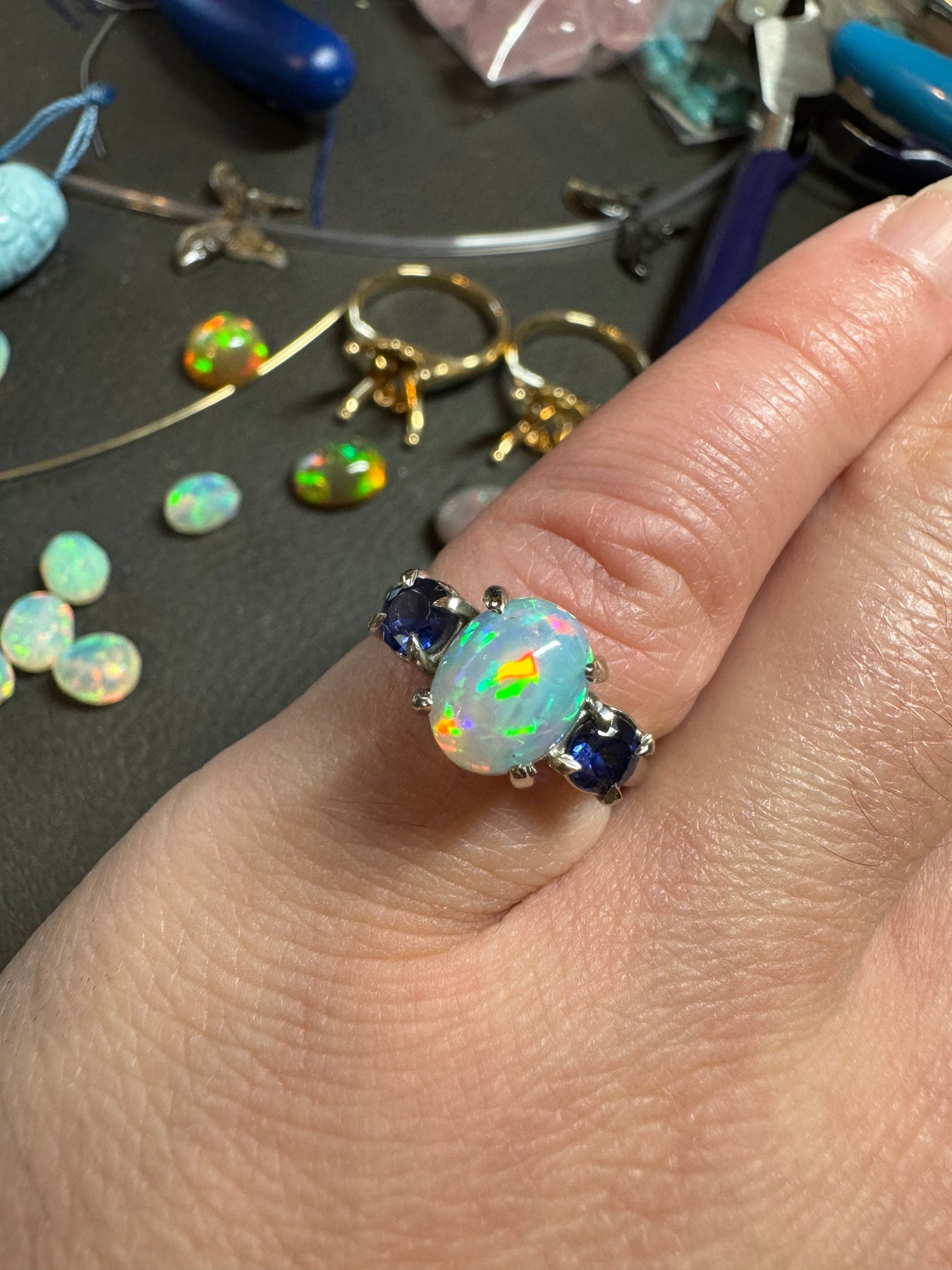 Custom opal ring showing color play and blue sapphire side stones